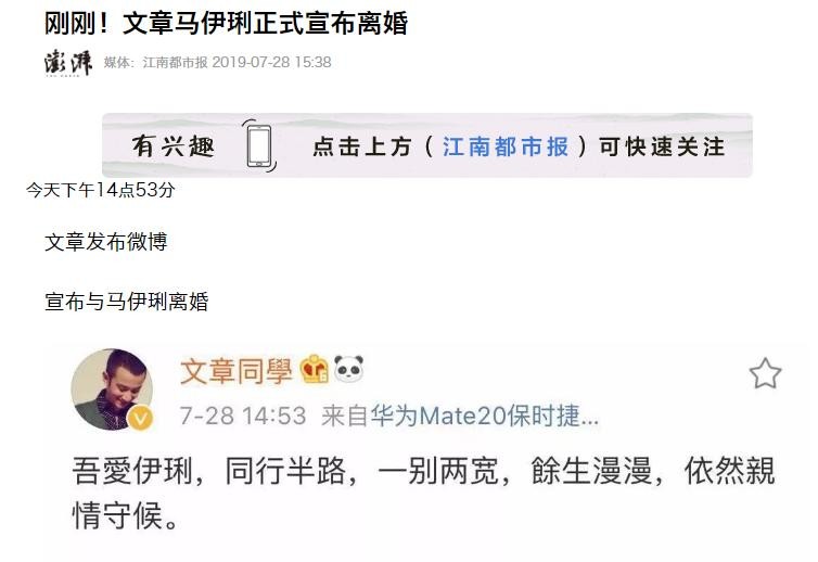 但看似甜蜜的婚姻却没有经过时间的考验,自从文章被爆出轨,这对令人羡慕的夫妻,婚姻也走向了尽头。面对丈夫的出轨,马伊琍选择与文章和平分手。