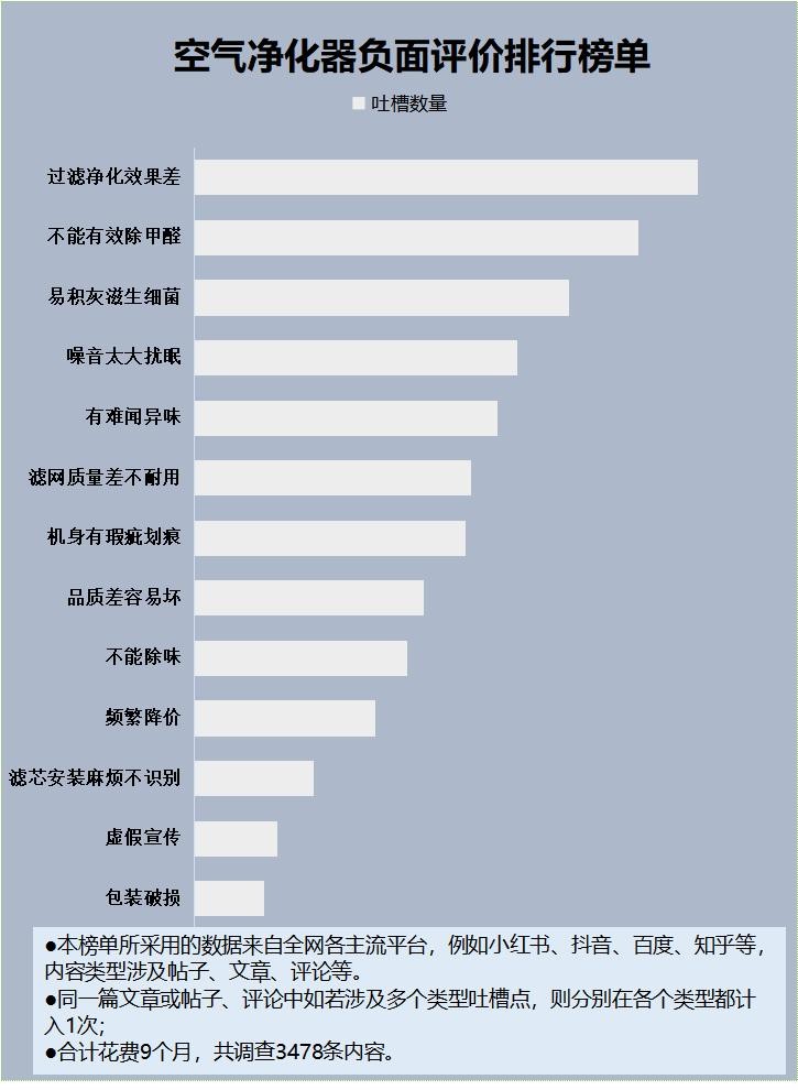 空气净化器有用吗?虽然高品质的空气净化器能够帮助我们改善生活环境,然而,不难发现,众多在线平台上充斥着对空气净化器的负面反馈,这使得消费者对空气净化器的实际效果产生了疑虑。接下来,我就借助权威机构收集的全网对空气净化器负面评价统计图,来给大家详细讲解劣质空气净化器的不良现象。