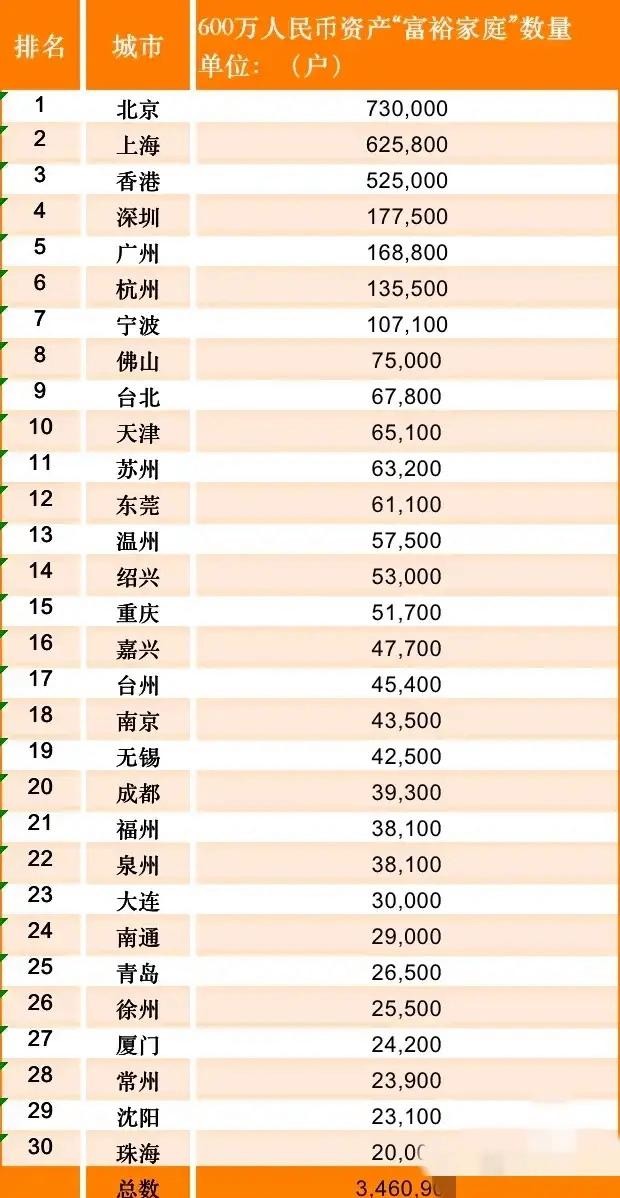 首先来看看咱们的"榜首大哥"北京。作为首都,北京这次以73万户资产超过600万的富裕家庭数量,稳稳地坐在了第一把交椅上。要知道,这可是比第二名的上海多出了10万多户呢!看来咱们首都的老百姓们,日子过得是真不赖啊。不过话说回来,能在北京买得起房的,那可不都是普通人啊。