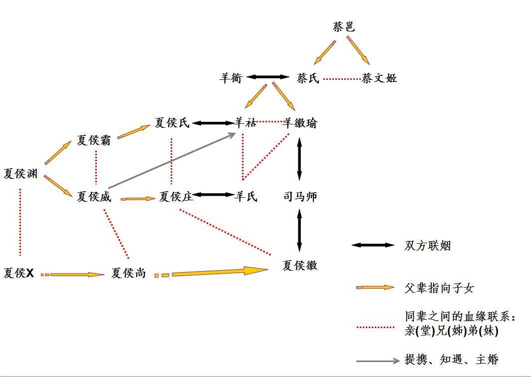 夏侯霸有个女儿夏侯氏嫁给了羊祜,由四弟夏侯威主婚,羊祜的母亲是蔡邕的女儿蔡文姬的姐妹,羊祜的姐姐羊徽瑜嫁给司马师,羊徽瑜的堂妹嫁给了他堂姐的弟弟羊祜结婚时的主婚人夏侯威的儿子夏侯庄,羊徽瑜的老公的原配是他老弟羊祜结婚时的主婚人夏侯威的堂兄夏侯尚的女儿夏侯徽,死的不明不白,千百年后成了司马家族的又一罪名。看懂我上段内容理清关系的请举手,我不喜欢不诚实的人,没看懂就对了,我都不知道我写的是什么鬼玩意,这关系网太难理了。