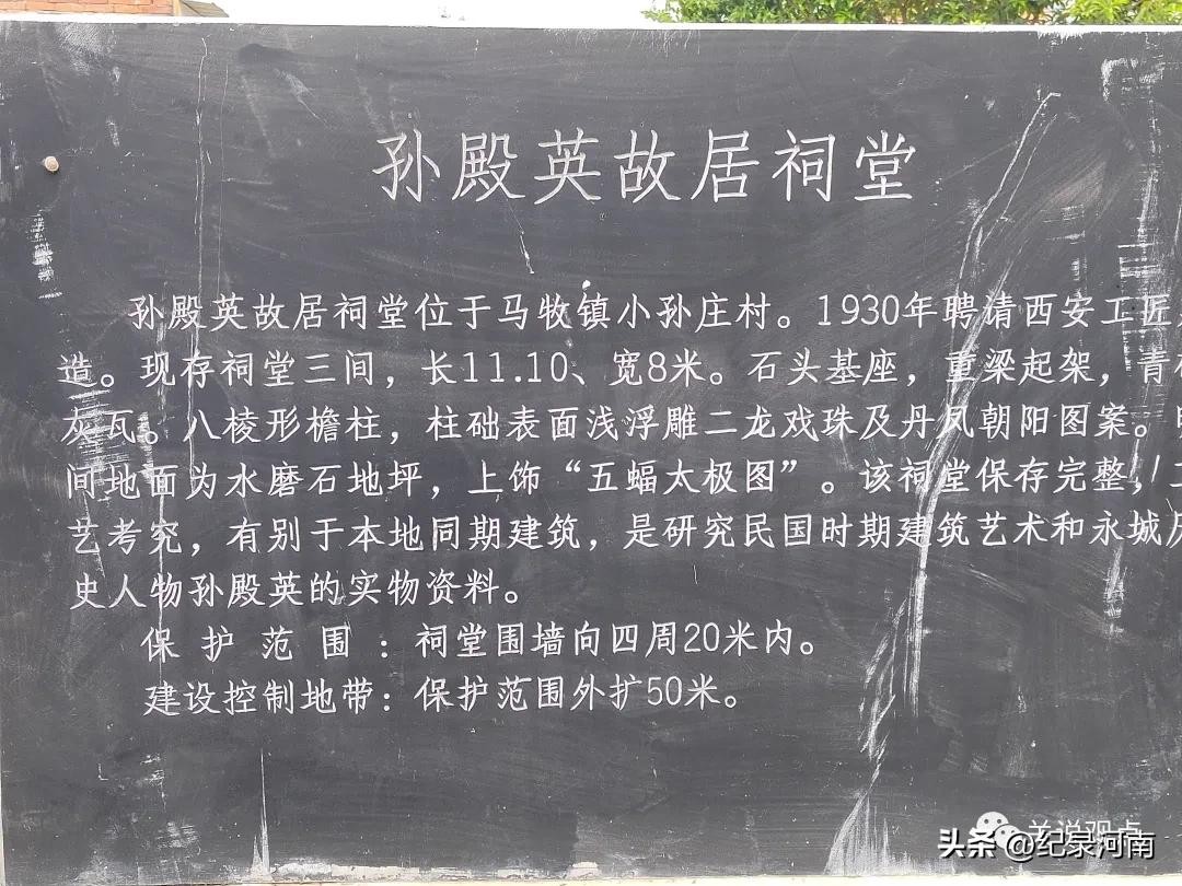 孙殿英东陵盗宝发了横财,1929年前后,开始在永城老家孙庄大兴土木,建宅、立祠、造墓。到孙死时,家中建设工程尚未完工。现在其故宅上尚保留三间青石基座、硬山灰瓦、五架方木重梁、彩色水磨石地坪的祠堂,石柱础雕龙刻凤,挑檐枋雕刻龙头虎首。祠堂周围散落着很多石刻,其中还有未雕成功的狮子柱础石等。
