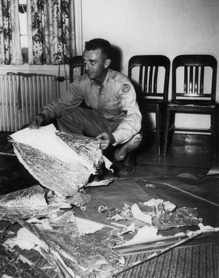 1947年7月8日,陆军部队公共资料处的官员宣称他们得到了坠毁的UFO残骸。然而仅仅数小时之后,他们又收回了第一次声明,改口称他们误把气象气球的残骸当成UFO的残骸了。