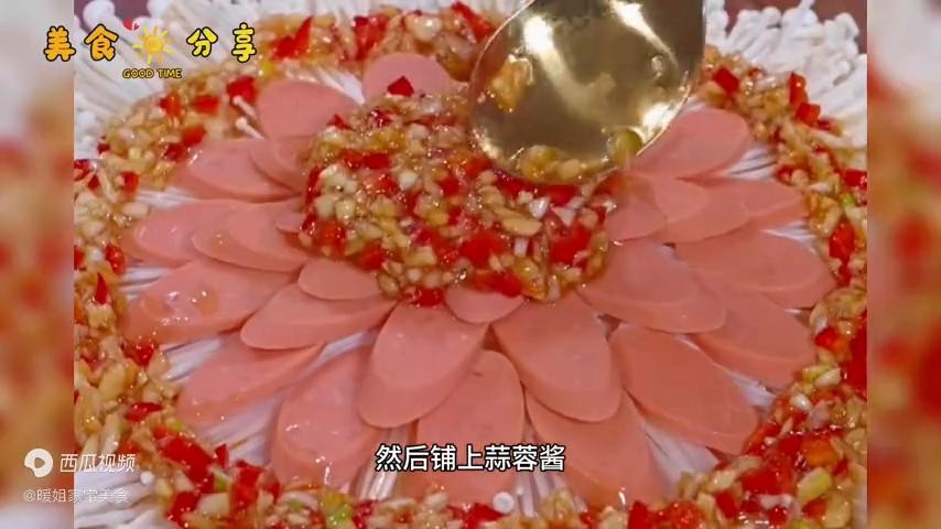 →金针菇去掉根部,摆一个老婆喜欢的造型,然后火腿肠也切成片,也摆入盘中。