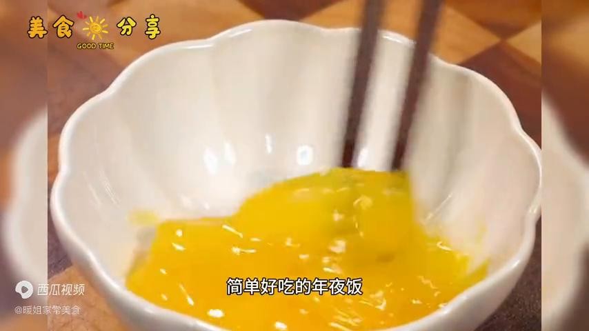 →碗中打入一个鸡蛋,快速打散。