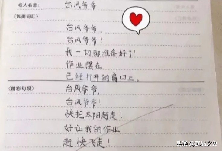 “双减”政策出台之前,孩子们的作业非常多,时常压得孩子们透不过气来。在这种情况之下,这位小学生只能请出“台风爷爷”来帮助,希望借助台风爷爷的风力,把摆在窗口的作业吹走。