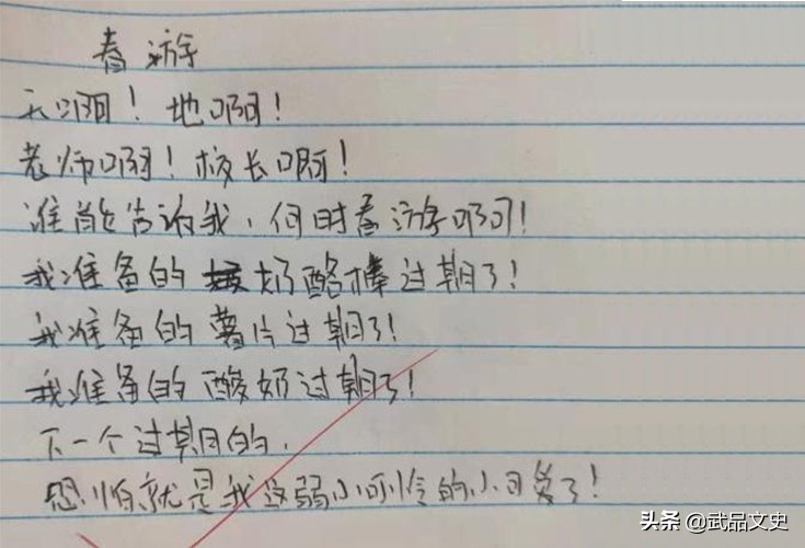 正常来说,时间一般使用天,星期,月,年等单位来计算。可这位小学生却用食物的过期时间来对比等待春游的时间。