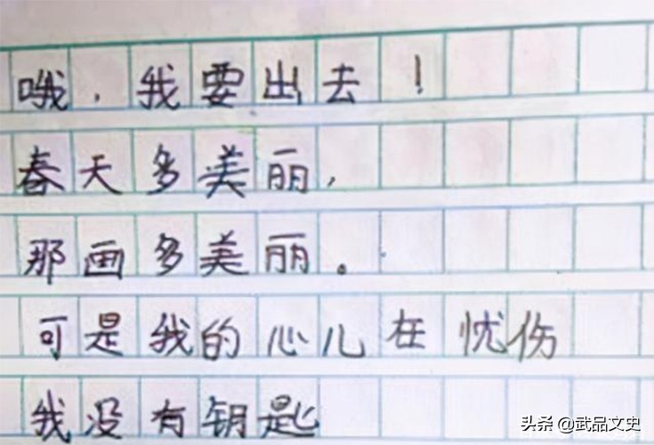 然而不能出去的原因让人很无奈,原来父母都出门了,将小朋友一个人锁在了家里,所以只能忧伤地写下这首打油诗。