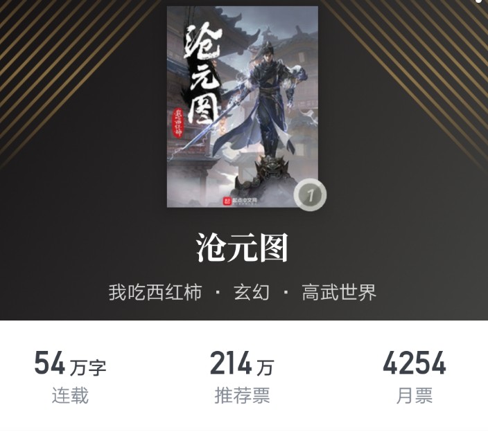 白金大神我吃西红柿继《飞剑问道》又一力作,虽然感觉番茄越来越水,但是从番茄《星辰变》巅峰时期到现在也有很多年了,水平有所变化也是理所当然,当然这本《沧元图》也是一本超水准的玄幻小说,值得一看!