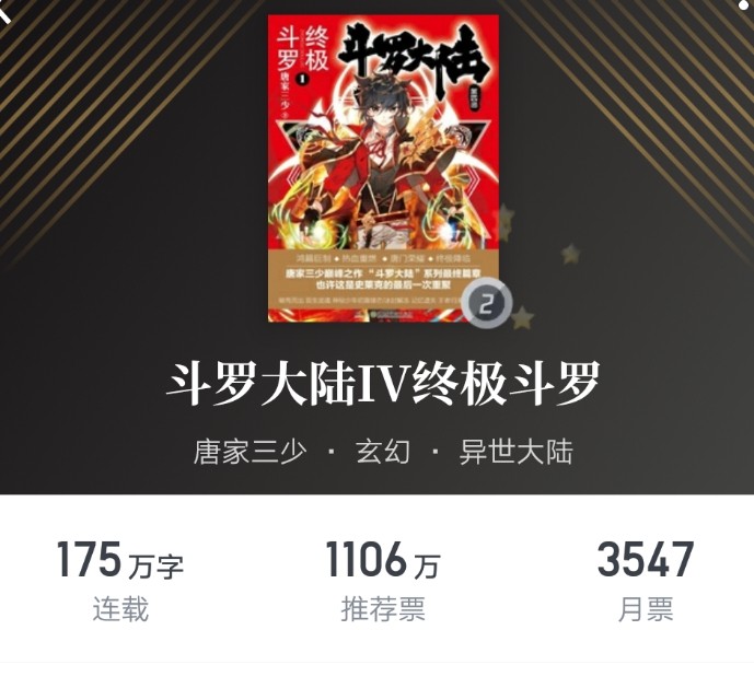 三少这是准备一招鲜吃遍天啊,咬住斗罗不放了,四部曲终章终极斗罗还是根据以往的风格展开,相信了解唐家三少并且看过斗罗前几部的人都不是很想看这本书了,毕竟审美疲劳,一直看也受不了哦,不过这并不影响这本书的成绩,一些老粉丝加上一些慕名而来被剧情吸引的新粉丝们还是一股不俗的实力。
