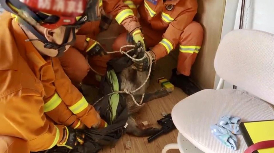六、近日,北京门头沟一小区居民家中闯入一头受伤野猪,消防员接警后到场处置。野猪体长一米多,体重五十斤左右,右前腿受伤无法行动。消防员在相互配合下成功制服野猪,并用胶带缠住其嘴巴和后肢,随后转交给派出所民警处理。居民对消防员及时抓捕野猪表示感谢,称野猪未对人员造成伤害,但看着吓人。