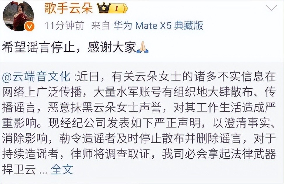 九、10月29日,刀郎徒弟云朵所属公司发声明否认网络上关于云朵“背叛师门”“背信弃义”等不实信息,并表示云朵演唱歌曲未牵扯任何版权问题。声明中指出,这些造谣内容已经委托律师进行取证。