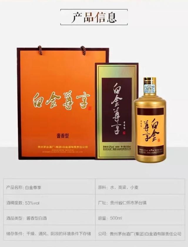 白金尊享酒产于中国贵州省仁怀市茅台镇,以水、本地高粱、小麦为原料,利用得天独厚的自然环境,采用科学独特的传统工艺,精心酿制而成。具有清亮透明、酱香突出、香气幽雅、空杯留香持久、酒体醇厚、丰满协调、回味悠长的典型风格。
