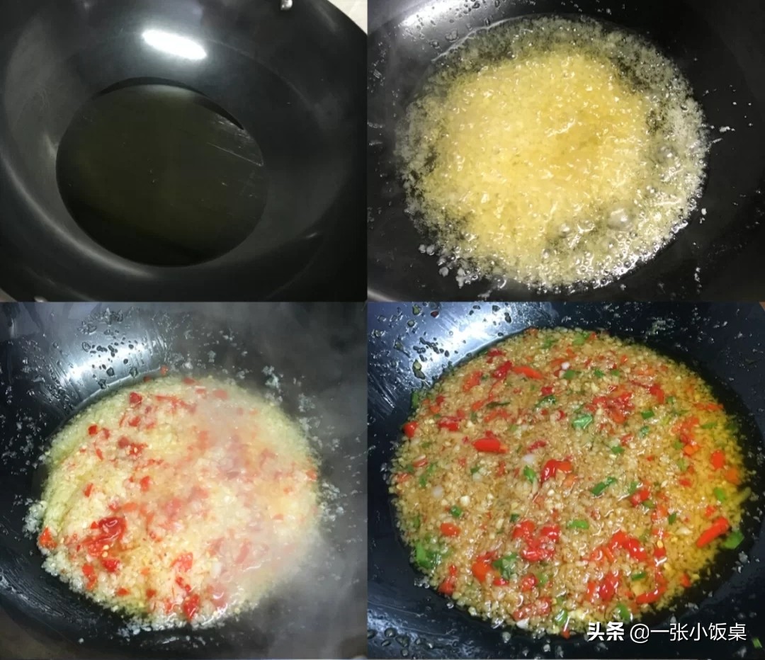 1、大蒜去皮,打成蒜蓉,小米辣洗净搅成辣椒末,小葱切成小段。锅中倒油,要多倒一点,油温五成热,下入一半的蒜蓉,小火慢炒。