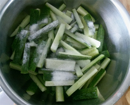 把黄瓜两头去掉,切成小长条,放进干燥的盆中,加入适量食盐,抓拌均匀,腌制两个小时,这一步必不可少,为的是杀出黄瓜里的水分,这样做出来的腌黄瓜才会更清脆。