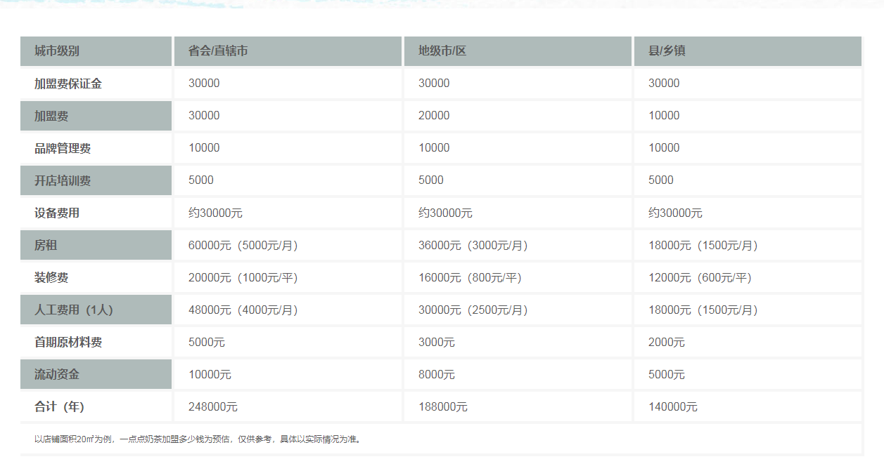 (1)加盟费用:一线城市:28.1万;二线城市:21.9万;三线城市:15.5万