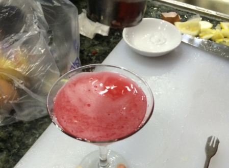 9、将鸡尾酒权杯里的冰块倒掉,滤入鸡尾酒。