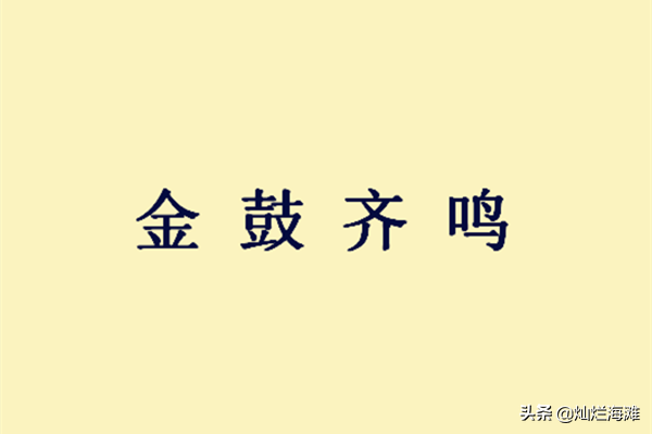 本文要介绍的成语,是文中提到的“金鼓齐鸣”, 意为金钟战鼓一齐响起。形容战斗气氛紧张激烈。这句成语的最早出处是《左传•僖公二十二年》中的“金鼓以声气也。”