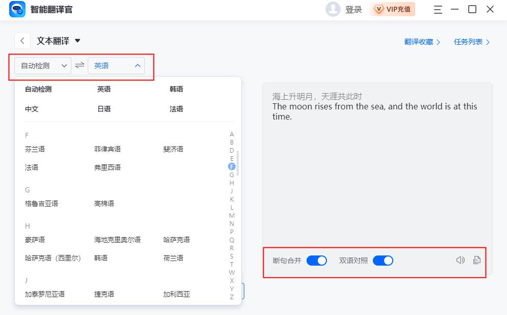 支持对文档、图片、文本、截图和剪贴板进行翻译,可批量操作,能自动检测语言并做到多种语言互译,可对译文进行语音朗读、断句合并、双语对照、复制收藏等处理。