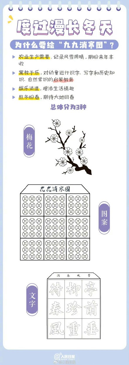 今日,三九。自古以来,我国民间就有“数九”习俗,从冬至起,每九天算一“九”。人们还用填图、写字等方式,填充数九时期的日历,这就是“九九消寒图”。愿你温暖过冬,共盼春回大地!