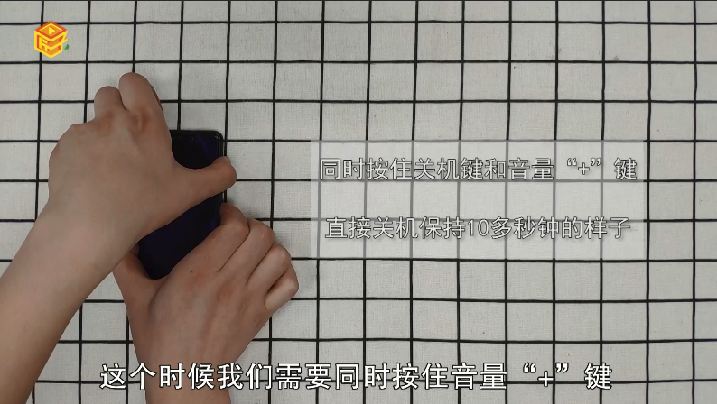 2、等到关机后。我们需要重新开机,这个时候我们需要同时按住音量“+”键,保持10多秒钟的样子。