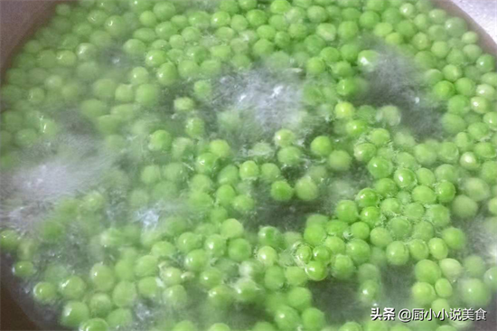 第一步,将豌豆去掉外壳,剥出豌豆粒,用清水冲洗干净,滤干水分备用。