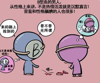 男人的表现:最忌讳别人对他视若无睹,忽视其存在,即使还不很热络的朋友,在人前也尽可能热烈支持 。B型男性喜欢天马行空。言不及义地高谈阔论,却不喜欢他人断章取义,对其俏皮话。幽默感要有反应,否则反招致不快。委托事项只交代大原则即可,别限制他细部的作法及制约其行动。长时间的约会,必须配合其步调,别老谋深算计画到太遥远的未来,B型男性不喜欢时空束缚的感受。B型男性的性质根本不把细小的事当一回事,好动、好自由,不希望别人束缚,常有打破传统式行动,有独创的一面。所以由外人来看,是独断独行的人。为人富於幽默,有独创性。但是,过度的人就”乐天派”的人了。有时候,一知半解即行动,所以产生的场面。但是很介意自己的失败,不久即恢复力气。为乐而忘忧型。身体方面,宜注意循环器官、消化器官、骨骼、肌肉等方面的疾病。面对毫无关系初次见面的对象,B型男性总希望给人很好的第一印象,故在初次见面的信号反而令人难辨。不过后来对你明示自己的兴趣的话,或谈自己的事,可就有希望,坦白心意正是典型的B型男性。