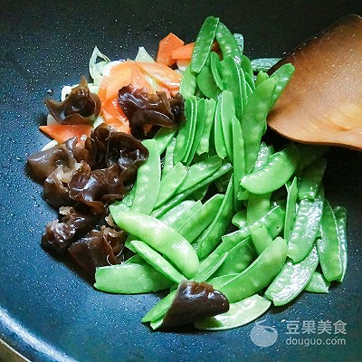5、加木耳、荷兰豆翻炒。