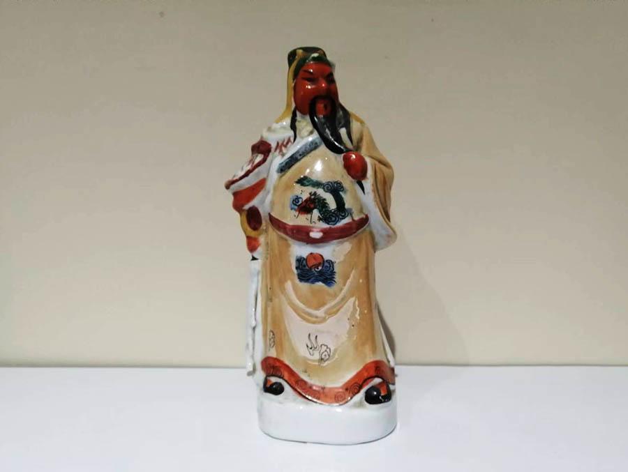 关老爷就是关公、关帝。全称为“忠义神武灵佑仁勇威显护国保民精诚绥靖翊赞宣德关圣大帝”。本尊关老爷,瓷质,通高22、肩宽11、底座宽9、厚8厘米。正面站立,丹凤眼,卧蚕眉,赤脸长须,头戴云头纶巾,身穿金甲,足蹬云头战靴,左手捋须,右手持青龙偃月宝刀,英勇威武。