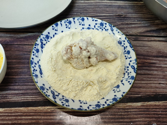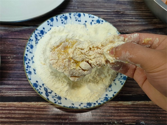 6、把裹上鸡蛋液的鸡翅根再次放入盘子里,表面再裹一层炸鸡裹粉,然后抖掉表面多余的裹粉,就可以准备下锅炸了。