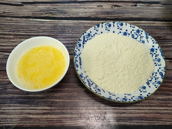 3、准备一个小碗,碗里打入两颗鸡蛋,用筷子搅散备用;再准备一个盘子,盘子里加入适量炸鸡裹粉备用。炸鸡裹粉是用几种淀粉和面粉按照一定比例混合调配而成,用这种裹粉做出的炸鸡表皮非常酥脆,炸鸡店用的都是这种裹粉。