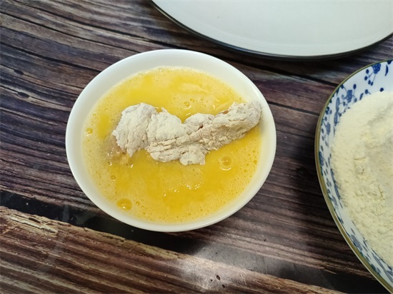 5、把裹上炸鸡裹粉放入蛋液碗里,均匀地裹一层鸡蛋液。