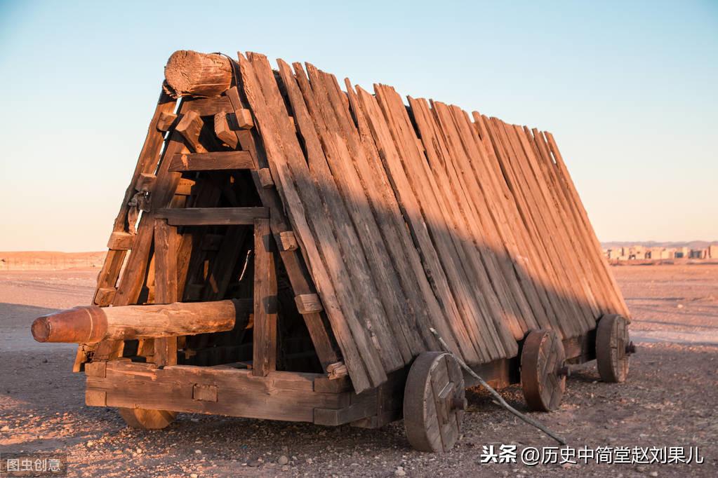 "粘罕填濠之法:先用洞子,下置车轮,上安巨木,状如屋形,以生牛皮幔上,又以铁叶裹之,人在其内,推而行之,节次相续,凡五十馀辆,人运土木、柴薪於中。"《续资治通鉴长编拾补.卷56》