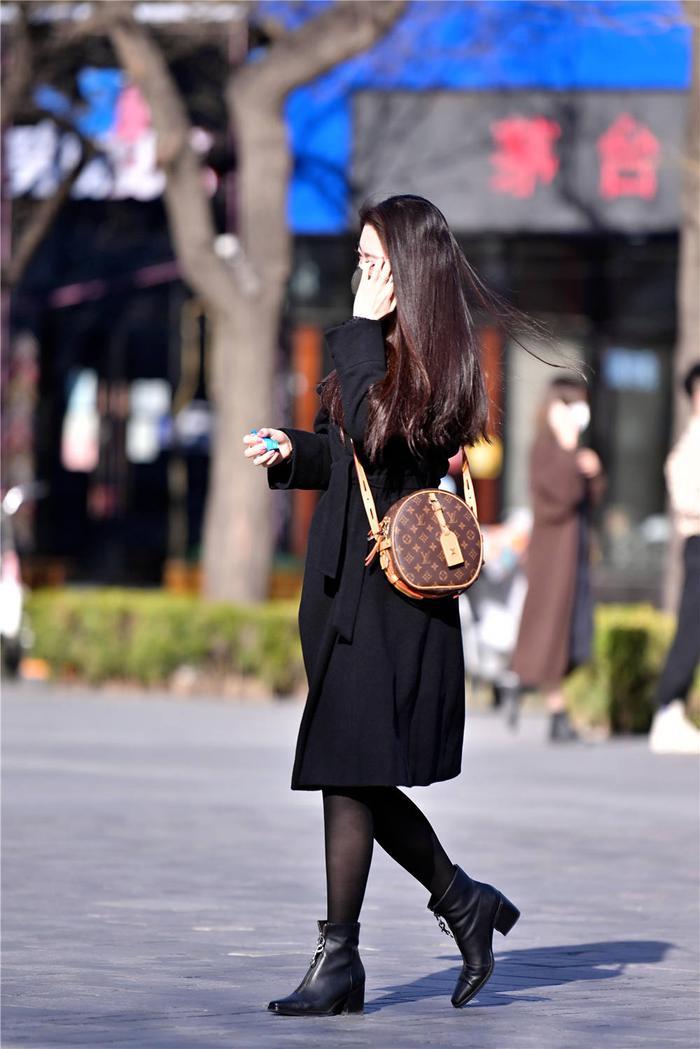在春天里,不少人还是喜欢搭配短靴,高跟的款式衬托身材,也搭配出精致美,短靴也是春天常见的单品,短靴的选择,无论是粗跟还是细跟,要精致简约一些,版型要好看一点,这位美女选择粗跟短靴,鞋跟大约在5厘米左右的高度,前面有拉链设计,搭配黑色丝袜,非常厚实的设计,保暖效果好,也修身,搭配黑色呢子大衣,衣摆到膝盖的位置,一款褐色的圆饼单肩包,斜背在肩上,增加色彩和层次感。