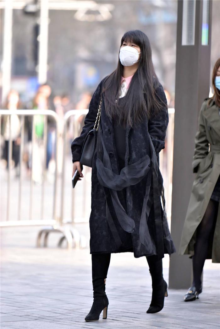 时尚美女,会有自己的搭配风格,春天出门,也要注意保暖,这位美女穿着一双黑色尖头细跟短靴,真皮的款式,也搭配出精致姑娘,尖头细跟款式很好看,搭配一款黑色的紧身裤,美女身材很苗条匀称,所以搭配也很好看,一款黑色的呢子大衣,稍微厚实一些,衣摆也比较长,过膝的长度,没有系扣子,也搭配出不一样的味道,时尚美女,还是要注意身材的保持。