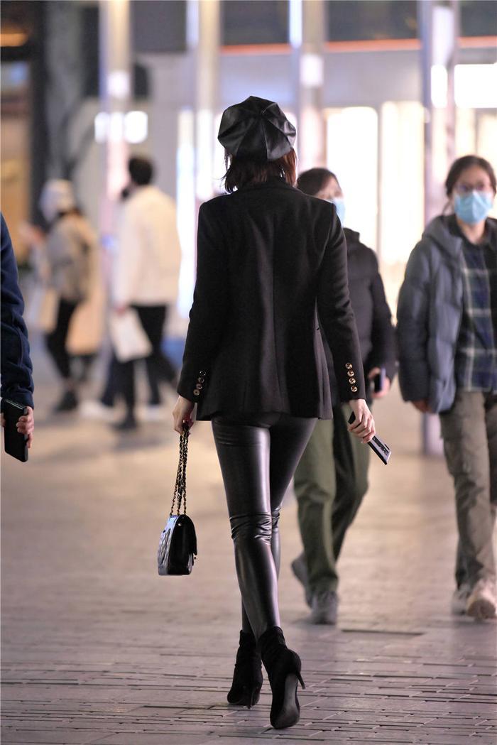 春天的美女,要注意搭配,什么风格是自己喜欢的呢,这位美女选择一双黑色尖头细跟短靴,绒面设计,色彩上比较低调,细跟设计,精致好看,搭配黑色紧身皮裤,美女腿型纤细笔直,所以搭配皮裤更好看,也是美女对于自己咨询你,才会搭配皮裤衬托自己,一款黑色的西服,袖口的金色扣子,起到很好的点缀效果,黑色的单肩包,拎在手里,看起来很好看,也比较别致,黑色也可以搭配出精彩的效果。