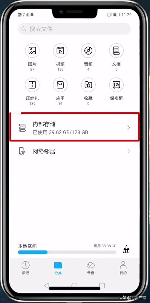 打开手机上的文件管理器,点击内部存储