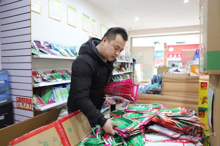 在另一家便民农资店,店主正在整理货品。据店家张仁伍介绍,在年前,店铺就已备货,节后陆续有农户过来购买。目前正是种植玉米的时候,进购了5吨玉米种,现在已经销售了2吨,销量还不错。