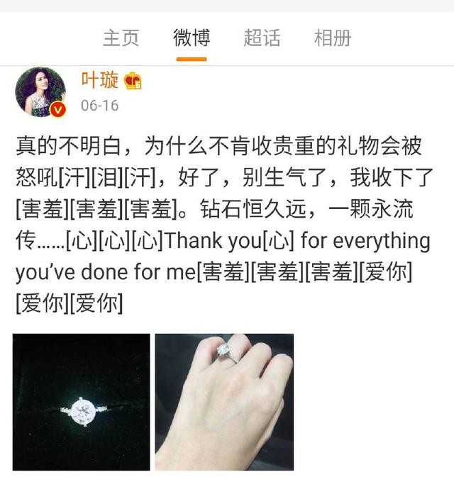 叶璇自公布新恋情开始,每日在微博秀恩爱,与男友一同出街,虽然没有清华男友的正脸照。但是晒男友送的鲜花,钻石戒指以及各种贴心礼物也是很欢乐,叶璇更是对男友送贵重钻戒给她表示娇嗔,疑似好事将近,叶璇粉丝也是纷纷祝福。