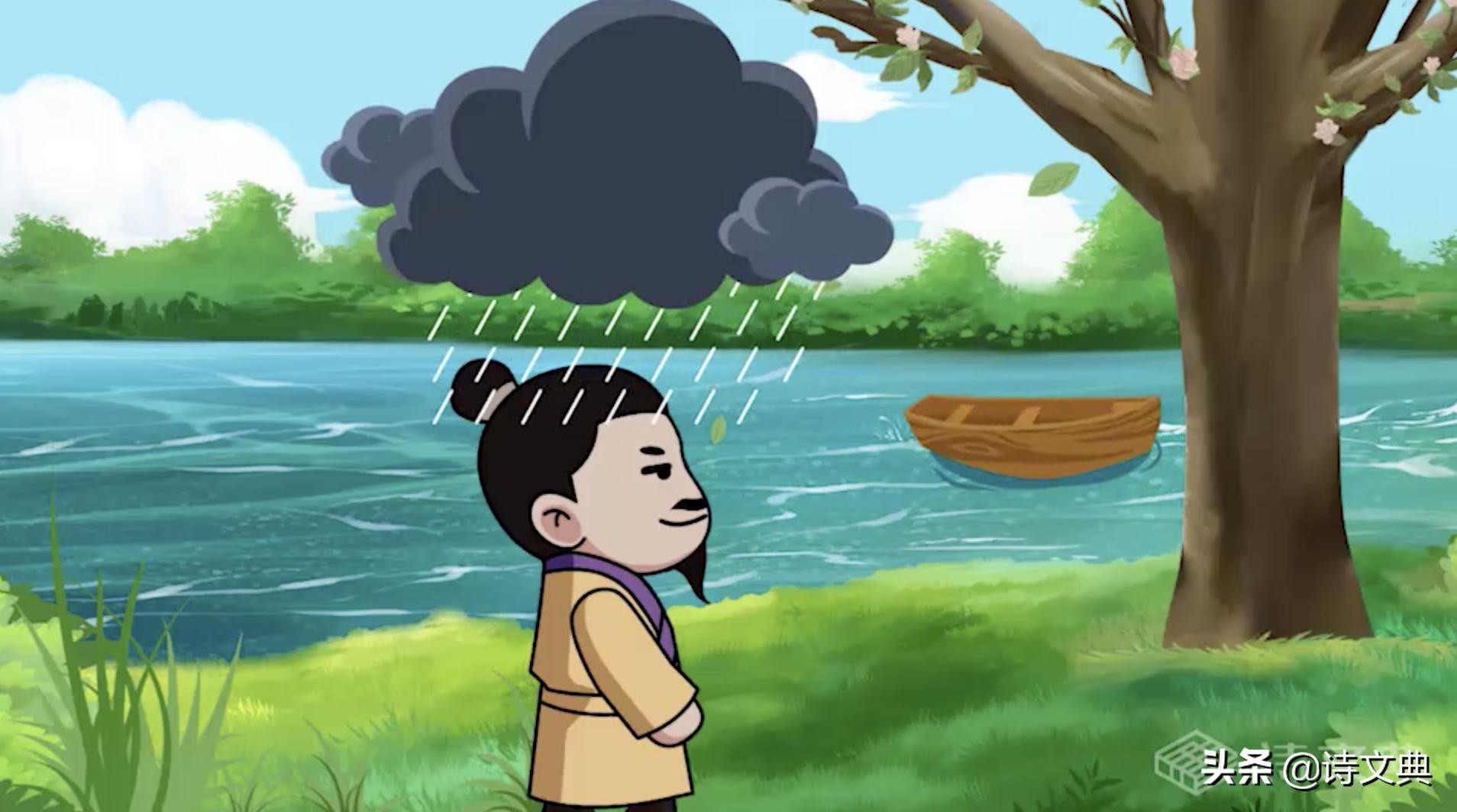 忽然,一片乌云飘过,下起了小雨,可韦应物却不在乎,他看见涨潮的水流在雨中变得非常湍急,一只无人看管的小船,在水中飘荡。“春潮带雨晚来急,野渡无人舟自横。” 这情景让韦应物感到,自己就像这小船,虽然人生的风雨也很急,可他不是仍然没被击垮,仍然能保持自在平和的心态嘛?