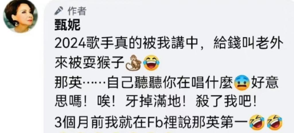 正当舆论沸沸扬扬之时,70岁的香港歌后甄妮站了出来,她毫不留情地质疑那英的实力,甚至讽刺那英敢拿冠军是“自取其辱”。