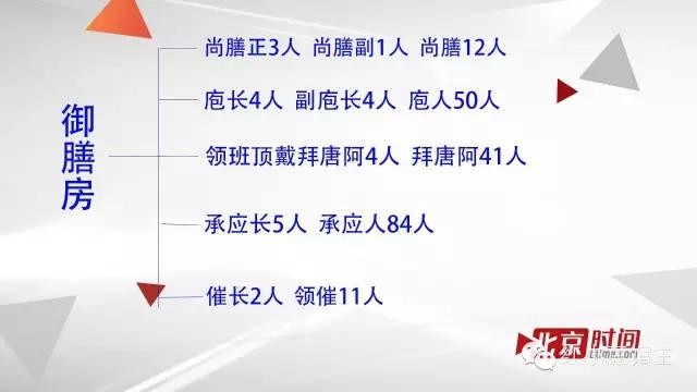 此外,还有专职一些杂务的,比如采买、摆放桌椅、收拾碟盘,也各有职务,共有147人。看到此处,不得不惊叹,御膳房实在是太大了,工作人员归了包堆一共200多人。当然,这些人并不是一个公共大食堂,而是每几十人伺候一位主子,比如皇帝本人要有几十人伺候,太后由几十人伺候,妃嫔中地位高的,也是有几十人伺候一个主子,但是妃位不高的,要跟某位后妃同居一宫的,那就是主位吃什么,她们就按照品级的份例,也由主位妃子的那些厨子给做。