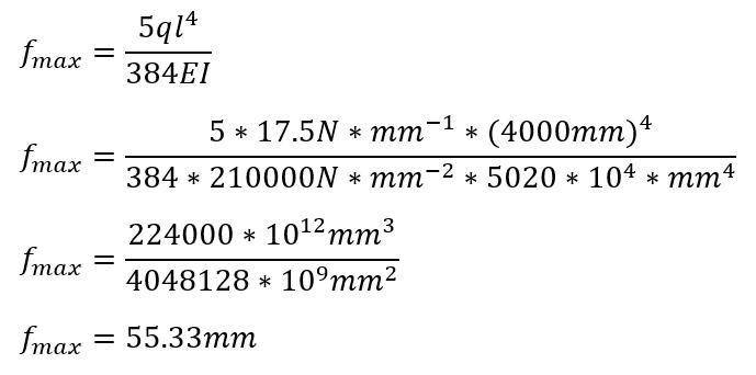 杆件受均布载荷,q N/mm, 杆件长度Lmm, 杆件弹性模量E, 杆件截面惯性矩I,最大挠度变形量fmax