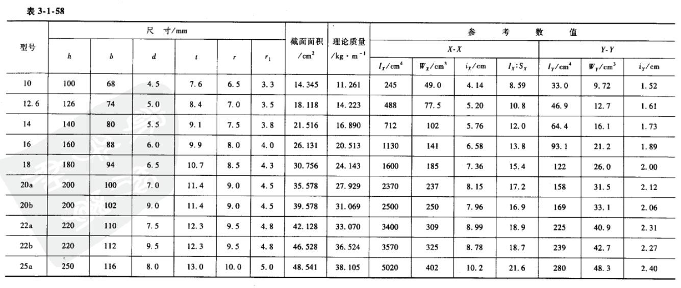 25a工字钢,查机械手册知截面惯性矩I=5020cm^4=5020x10^4 mm^4