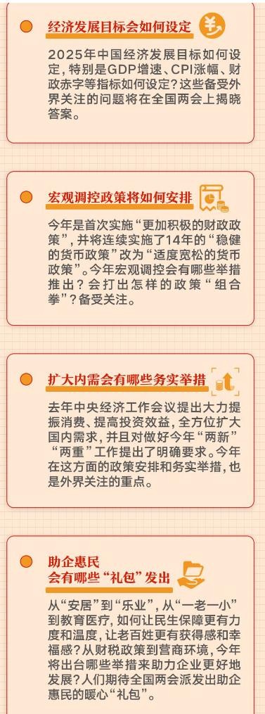 经济民生:今年GDP增长目标是多少?就业政策如何保障?养老金会涨吗?消费怎么提振?(例如2025年重点讨论“提振消费”“民营经济支持政策”等)。科技创新:人工智能、新能源等前沿技术如何发展?如何防止科技“卡脖子”?。社会热点:教育公平、医疗改革、房价调控、反“内卷”竞争,甚至年轻人关心的婚育政策,都可能成为议题。