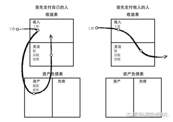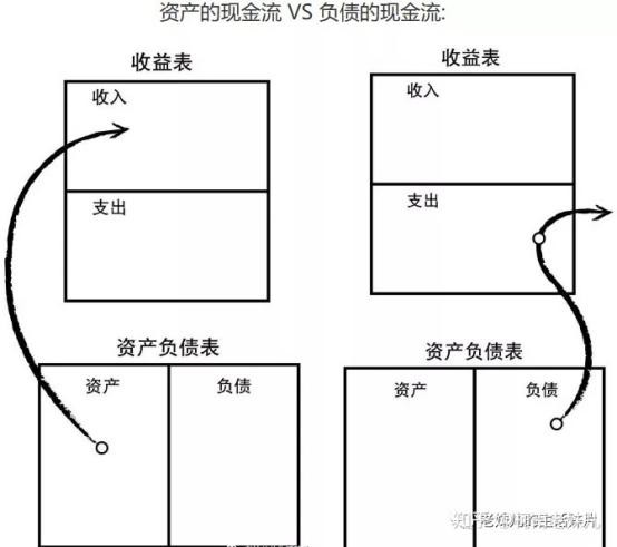 在我们的生活中,大到国家、企业,小到每一个人,都涉及到钱从哪里来、又支付到哪里去的问题,这就是现金流,它与资产、负债密切相关;《富爸爸穷爸爸》一书中对资产与负债的现金作下图表示: