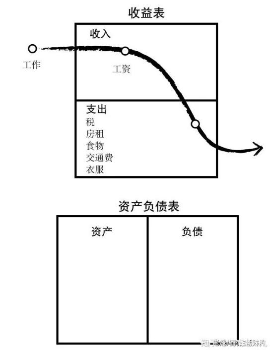 图表的上半部分是收益表,也常被称为损益表或是利润表,它被用来衡量收入和支出:金钱的进入和流出;图表的下半部分是资产负债表,它被用来资产和负债的情况,资产增加你的收入,它能把钱放进你的口袋;负债会把钱从你的口袋里取走。