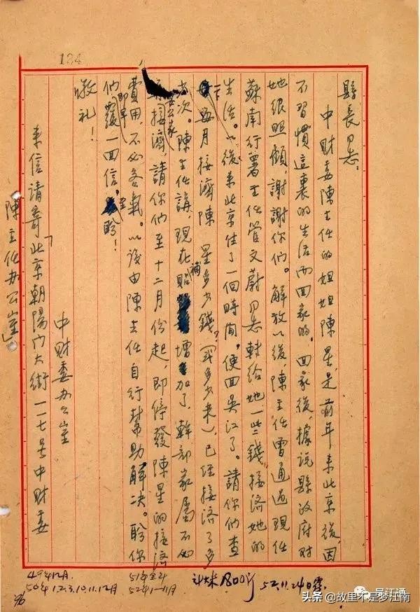 “中财委陈主任的姐姐陈星,是前年来北京,后来不习惯这里的生活而回家的。回家后,据说县政府对她很照顾,谢谢你们。解放以后,陈主任曾通过现任苏南行署主任管文蔚同志转给她一些钱,接济她的生活。以后来北京住了一个时间,便回吴江了。请你们查一下,每月接济陈星多少钱(或多少米),已经接济了多少次。陈主任讲,现在补贴增加了,干部家属不必再要公家接济。请你们至12月份起,即停发陈星的接济费用,不必客气。以后由陈主任自行帮助解决。盼你即早复一回信,至盼!”