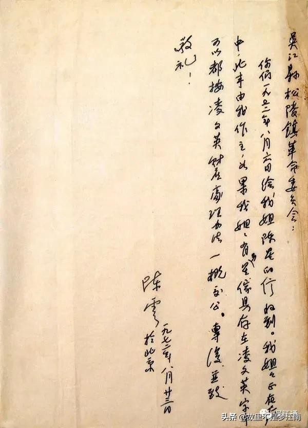 “吴江县长同志,我们于上月27日寄去一信,请于12月份起停发陈主任之姐在你县所领的家属优待费,但至今尚未接到回信。因陈主任现在供给较前提高,所以提出应自己补助其姐。但究竟过去由县政府 补助多少,请即告知。并请即告处理情况,为盼!”