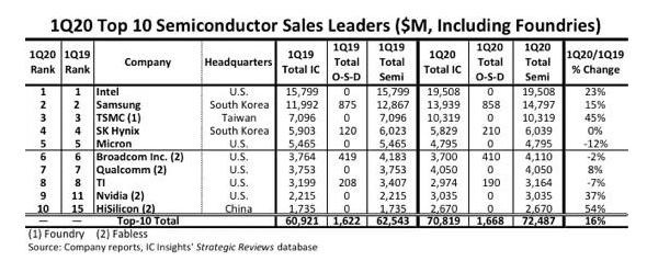Insights公布的2020年第一季度全球十大半导体(IC和OSD光电,传感器和分立器件)销售排名中,华为海思的销售额同比上涨54%,比上一季度增加了9.35亿美元,达到26.7亿美元,首次进入全球半导体TOP10榜单。