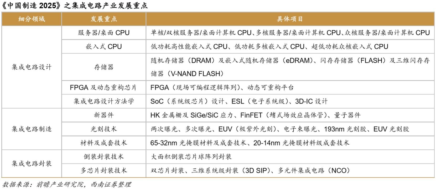 2014 年,我国发布了《国家集成电路产业发展推进纲要》,成立了国家级的集成电路产 业投资基金;《中国制造 2025》详细地规划了集成电路产业发展目标、发展重点、关键技术等。